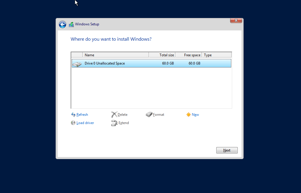 Step 10. Now a screen display asks where we want to install windows. Here you can create a new partition, delete a partition, or format the hard disk. After you have done this process then you can select the drive partition where you want to install Windows Server 2016. In our case, we have one partition. Once all set. Click on Next.