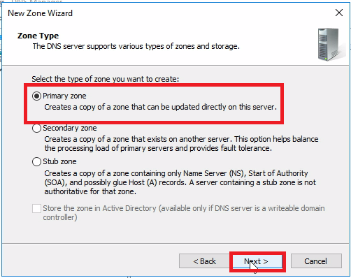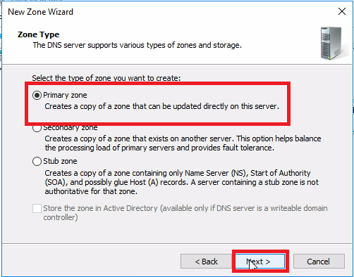 Step 3. A New zone Wizard will open. Choose “Primary zone” and click on “Next”.