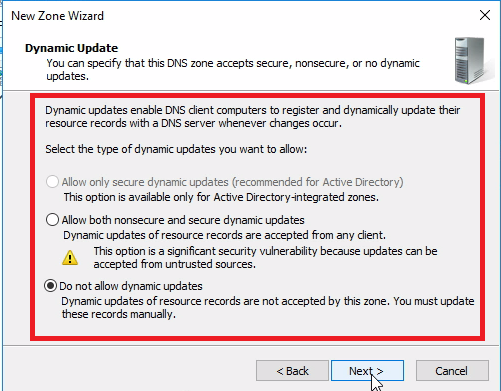 Step 7. Here you’ll be able to specify that this DNS zone accepts secure, nonsecure, or no dynamic updates. If you want to allow both nonsecure and secure dynamic updates, choose “Allow both nonsecure and secure dynamic updates” as shown below and click on “Next”.