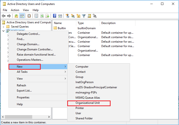Step 2. A new window of “Active Directory Users and Computers” will open. Right-click on the Domain name and Choose “New” and then Click on “Organizational Unit”.
