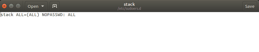 Step 4. Since this user will make many changes to your system, it should have sudo privileges. Now we have to give sudo privileges to the user “stack” which we created in the previous step. To do so open the stack file using “gedit” from this location “/etc/suoders.d/stack” and enter the below line in the file.