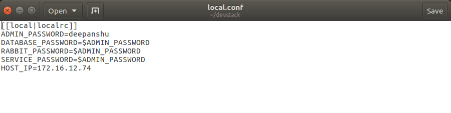 Step 8. -You should create a “local.conf” file in the root of the “devstack” directory and enter the below lines in the “local.conf” file. You can use a different password if you prefer and make sure that you use your own Ubuntu machine’s IP ADDRESS.