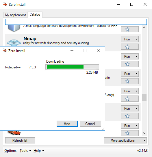 Step 4: Here I am choosing Notepad ++ which will start Downloading in Zero Installer.After downloading run the Software in the Zero Install. It will function with the software you downloaded without needing to physically install it on your laptop or computer.
